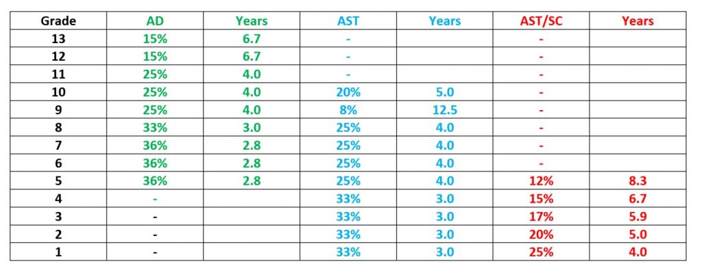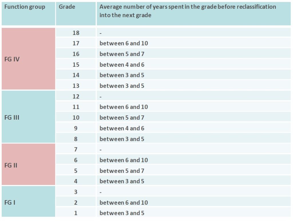 There are some staff (those who advance very quickly) who will have no need of steps 3 and beyond since they will already have jumped to the next grade up (via promotion/reclassification), but staff in certain grades almost certainly will reach that side of the scale e.g. step 5, normally 6 years in the same grade (‘seniority’) or even steps 6 or 7: 8 or 10 years of seniority (CAs only). Look at AST/SC4 and SC5, FG I grade 2, FG II grade 6, FG III grade 11 or AST9 for examples of long average waits.